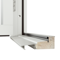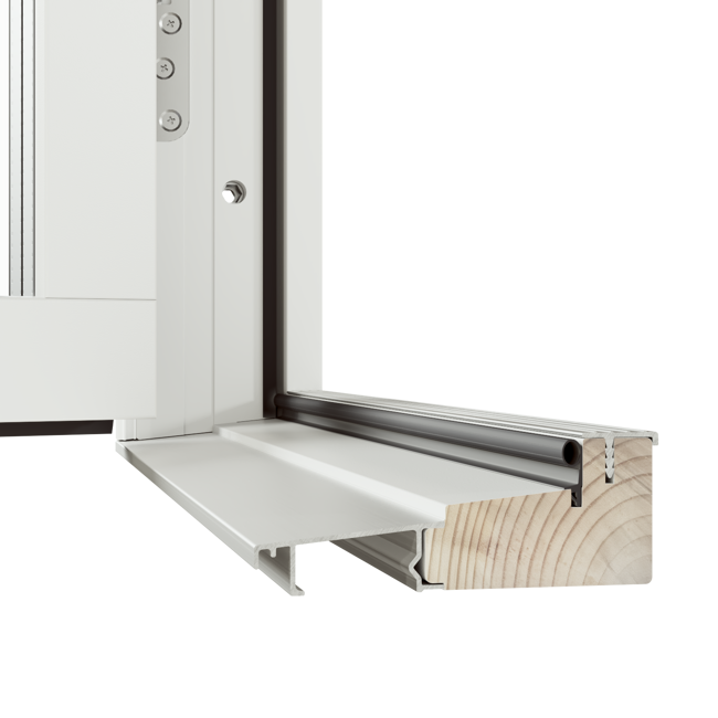 Precision Altandörr erbjuds med två tröskelalternativ, här visas den högsta varianten. Tröskel i trä med utvändig del av aluminium, höjd 42 mm.